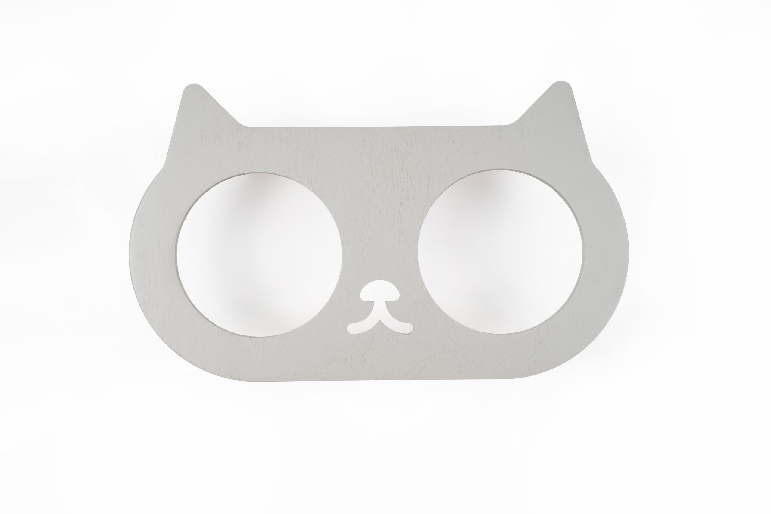Naturalny, drewniany stojak w kształcie kociej mordki na dwie miski 0,47L dla dużego kota